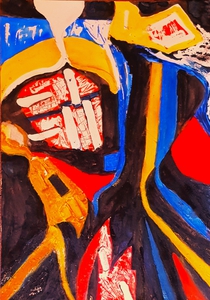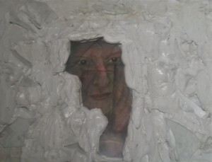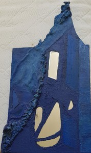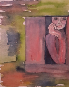 2002Vlak na de oorlog bezocht ik Kosovo. Diep geraakt door al de oorlogswedeuwen. Eerst een vrouw geschilderd. Daarna bedekt met gips waarin gebroken glas aangebracht. Haar uitzicht, haar toekomst ....zal het inmense verdriet ooit geheeld worden